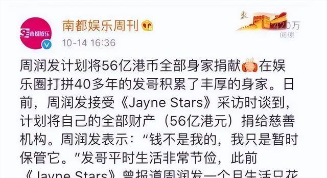 最重要的是,曾经标榜会将自己全部身家56亿全部捐出的周润发。