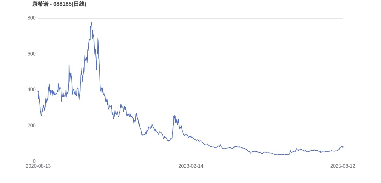 康希诺自2020年8月13日上市至今,已迎来5周年。从上市首日收盘价为393.11元、市值972.75亿元,到如今市值达到204.15亿元。