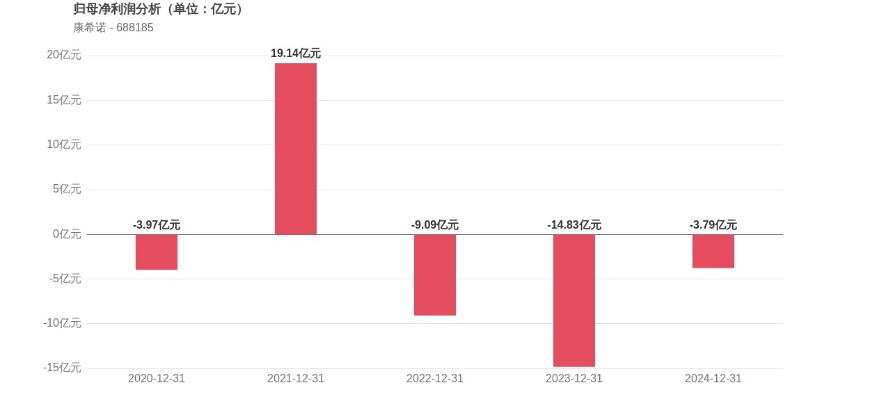 康希诺上市的2020年,当年实现归母净利润-3.97亿元。截至最新完整财年的2024年,公司实现-3.79亿元的归母净利润,近年累计下降了4.48%。这5年间,康希诺有4年出现亏损。